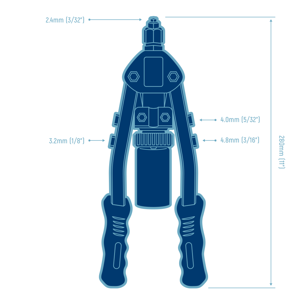 Designed for heavy industrial needs, manual rivet gun with adjustable hexagonal socket. It also allows for seat replacement, making it a versatile tool suitable for riveting sheet metal, manufacturing components, leather, plastic parts, and more.
